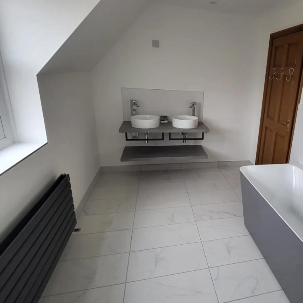 The introduction of jack and jill wall-mounted basins further elevates the bathroom’s contemporary feel. This innovative choice not only conserves space but also creates a sense of connectivity and shared functionality. The wall-mounted design adds an airy quality, contributing to the illusion of a larger space.